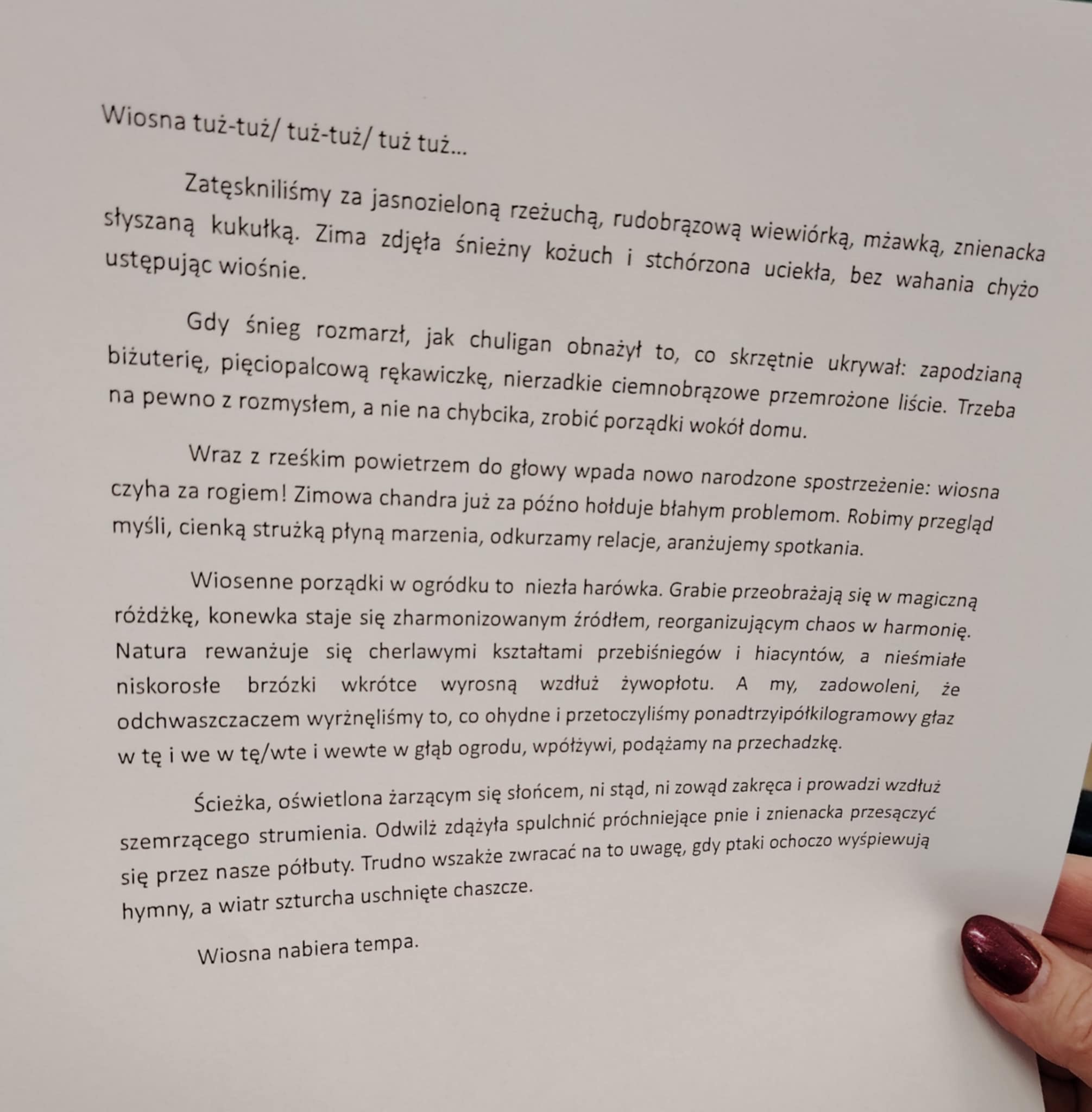 Tekst pod tytułem „Wiosna tuż-tuż” ukazał ucieczkę stchórzonej zimy, nie na chybcika robione porządki, rześkie powietrze, cherlawe kształty hiacyntów i niskorosłe brzózki, bo przecież wiosna nabiera tempa!